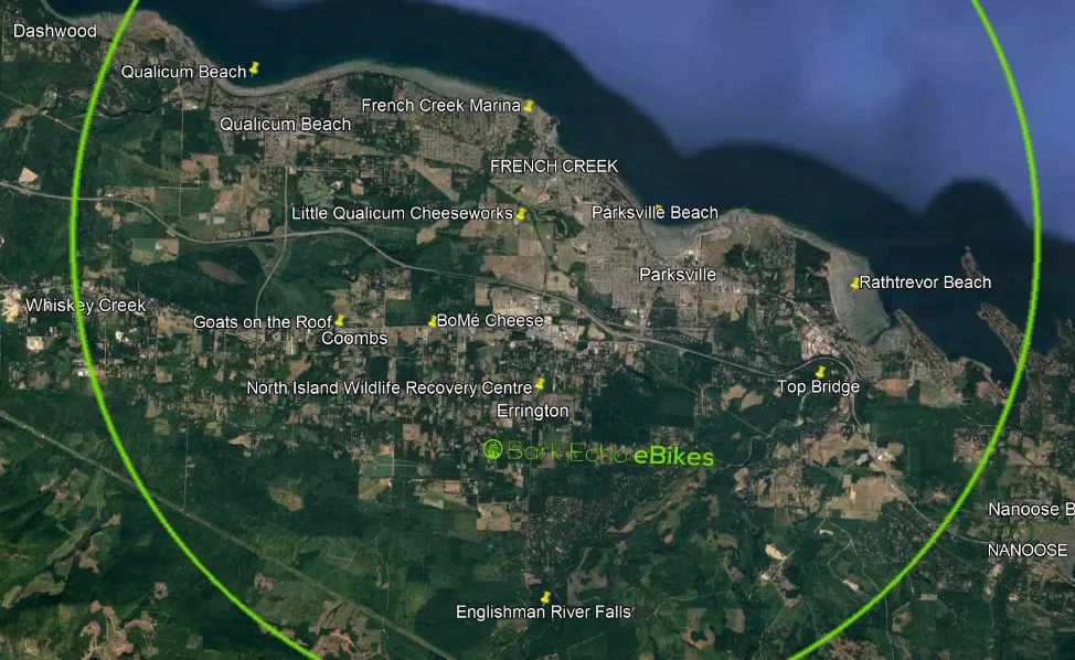 We will deliver your eBikes to your door, in the Parksville, Qualicum Beach, French Creek, Coombs, and Errington areas, between 9:00 - 11:00 AM and pick them up between 4:00 and 6:00 PM. Outside the delivery perimeter, please contact us.