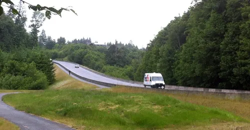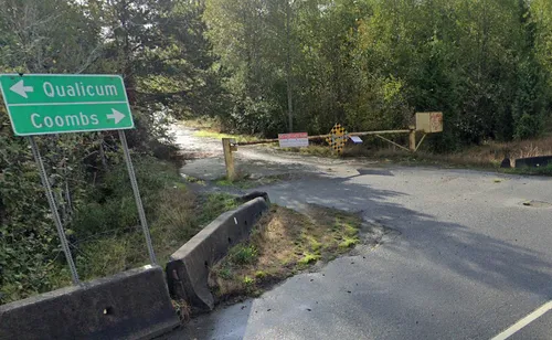 4 - The traffic circle is at the end of this pathway, a quarter of the circle sends you towards Coombs. Wide shoulders along the road make this section of the ride more bearable. You will bike under the four lane highway underpass.