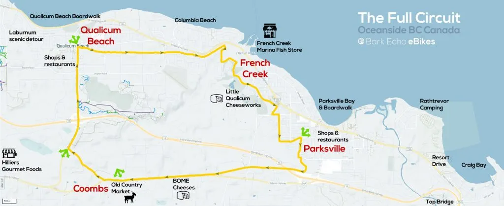 We used to call this ride “The Triangle”. A link between Parksville, Coombs, Qualicum Beach, and back to Parksville. Because of the nice bike path in French Creek, we would bypass it without really noticing. Might also be that there is no town centre there, more of a residential suburb. But there it is on the map below, French Creek, and it’s not a triangle, so we’ll just call it the Full Circuit. It has remained our ride of choice. Three to four hours, with lots to see and do on the way.