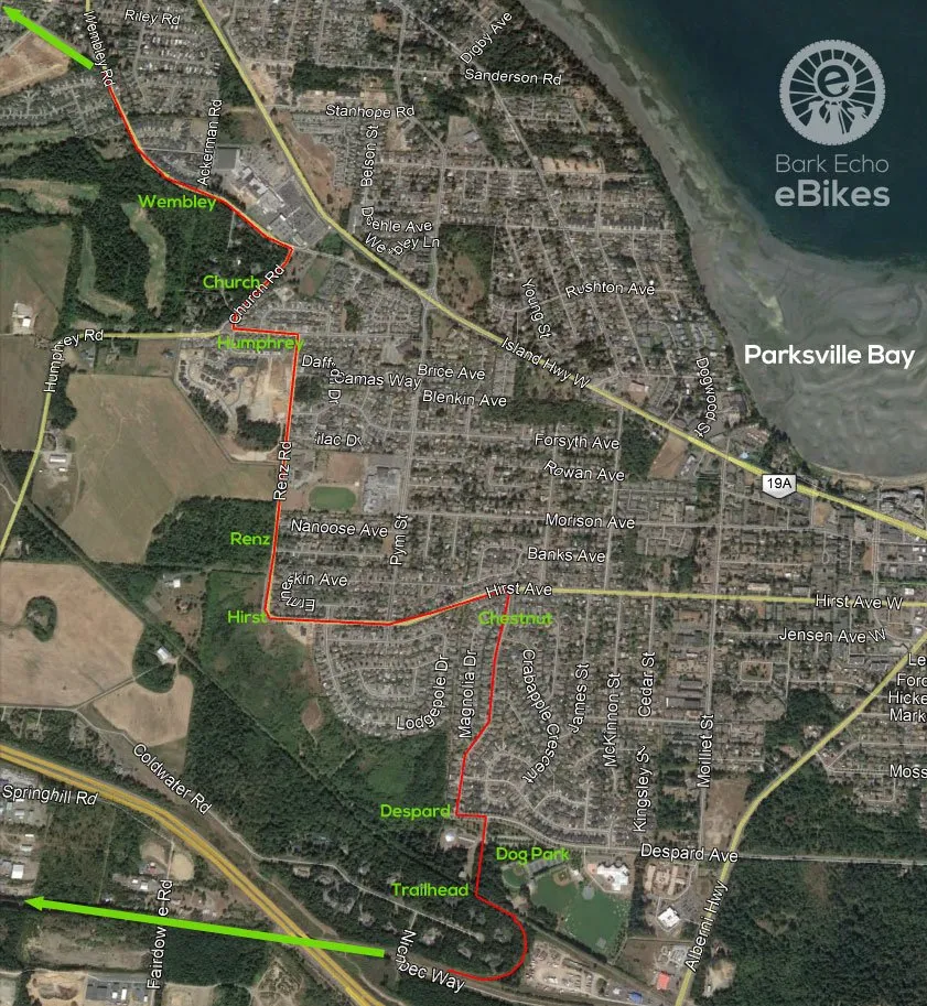 The only link-up missing is from the Wembley Mall (in the area close to the Little Qualicum Cheeseworks off-spur), to the trailhead behind the Springwood dog-park on Despard. Seeing as some of us learn with words, the list of roads is below. For those of us that learn better with images, the detailed map is below too! If you learn best with sound, have your biking buddy read it out loud to you as you fall asleep the night before!